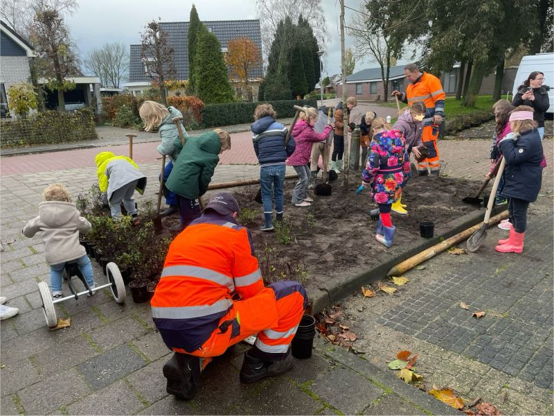 Op deze nationale Boomfeestdag hebben we vanochtend, samen met de gemeente De Fryske Marren en vier klassen van twee scholen in Lemmer Noord, in het kader van “Meer Biodiversiteit” de voorbereide borders rond de school en